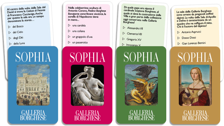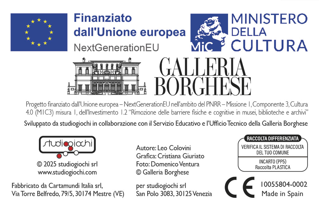 Un nuovo formato di quiz, giocabile con le sole carte, che ha per tema la Galleria Borghese e i suoi tesori. Le carte sono suddivise in quattro categorie: Pittura, Scultura, Storia e curiosità, Museo. Le domande sono difficili, se non si indovina al primo colpo si consente agli avversari di provare a loro volta, ma chissà… forse si avrà anche un’altra possibilità di risposta! Scopo del gioco è aggiudicarsi per primo una carta per ciascuna delle categorie.